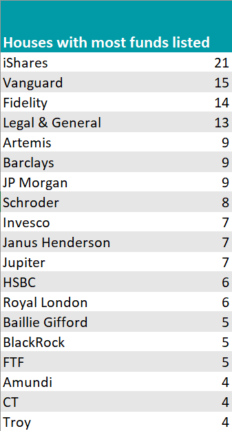 iShares, which is owned by BlackRock, topped the rankings with 21 recommended funds. The range is best known for its exchange-traded funds (ETFs), offering low-cost exposure to mainstream equity and bond indices.