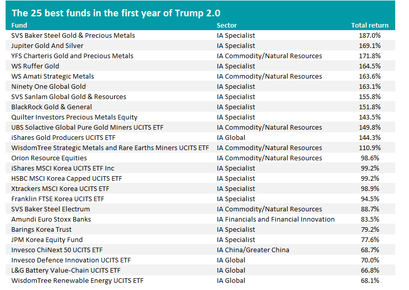 When it comes to how funds have performed over Trump’s first year, one trend is a standout winner: gold. The price of the yellow metal has set successive record highs over the past 12 months, sitting at more than $4,700/oz after an eye-catching rally.
