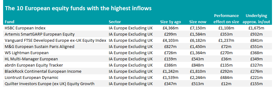 WS Lightman European is another fund with a good year behind it. A top-quartile total return of 31.4% added £270m to the fund’s size with inflows swelling it by another £368m.