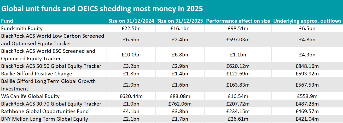 Other high-profile active strategies also struggled to retain assets. Baillie Gifford Long Term Global Growth (£568m outflows), Baillie Gifford Positive Change (-£594m) and Baillie Gifford Global Alpha Growth (-£367m) all saw substantial withdrawals, even though several delivered positive absolute returns in 2025.