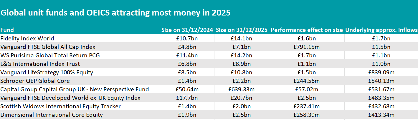 Vanguard FTSE Global All Cap Index followed closely behind, with £1.5bn of net new money and £791m from performance, lifting assets from £4.8bn to £7.1bn. L&G International Index Trust also featured prominently, taking in just over £1bn of inflows alongside a £1.1bn performance boost.