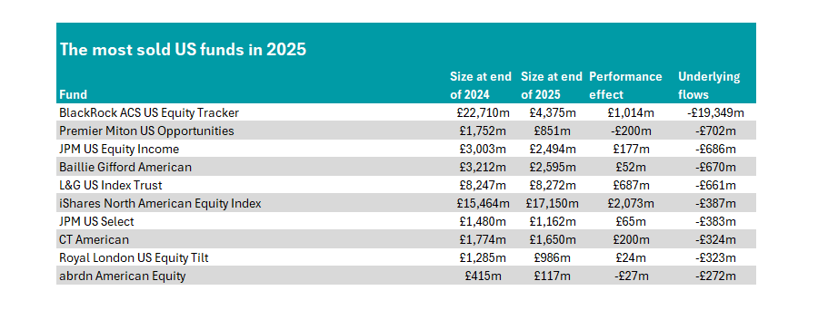 In total, 10 funds in the IA North America sector suffered net outflows of more than £250m in 2025.