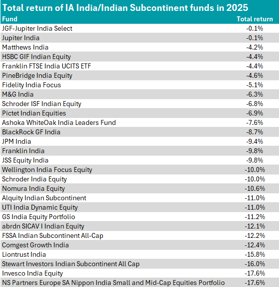 All of these forces ultimately filtered through to fund‑level performance, with all funds in the IA India/Indian Subcontinent sector ending the year in negative territory.
