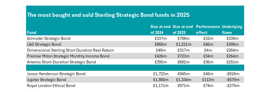 Schroder Strategic Bond and L&G Strategic Bond were the two funds to take in more than £300m, with Dimensional Sterling Short Duration Real Return, Premier Miton Strategic Monthly Income Bond and Artemis Short-Duration Strategic Bond all receiving net inflows of more than £250m.