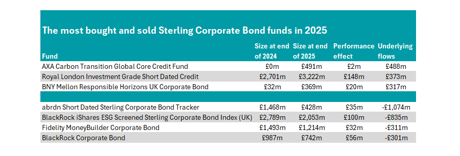 Another passive option, the iShares ESG Screened Sterling Corporate Bond Index (UK) fund was the second-most sold, with a net £835m removed.