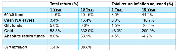 A traditional 60/40 equity-bond strategy has performed more credibly as £10,000 invested in a 60/40 portfolio 10 years ago would now be worth £14,418 in real terms, a gain of 44.2%.