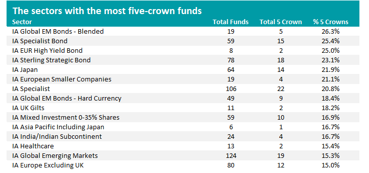 Fixed income sectors IA Specialist Bond, IA EUR High Yield Bond and IA Sterling Strategic Bond round out the top four, while equity peer groups like IA Japan, IA Global Emerging Markets and IA Europe Excluding UK have more than 15% of funds with five crowns.