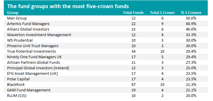 Meanwhile, Artemis has nine of its 22 funds (40.9%) with five crowns, among them Artemis Global Income, Artemis SmartGARP UK Equity and Artemis Monthly Distribution.