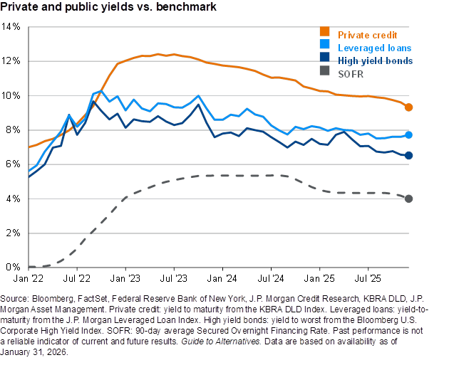 Even after compression, private credit yields today are 9.3%, around 160 basis points over broadly syndicated leveraged loans, and around 280 basis points over high yield bonds.