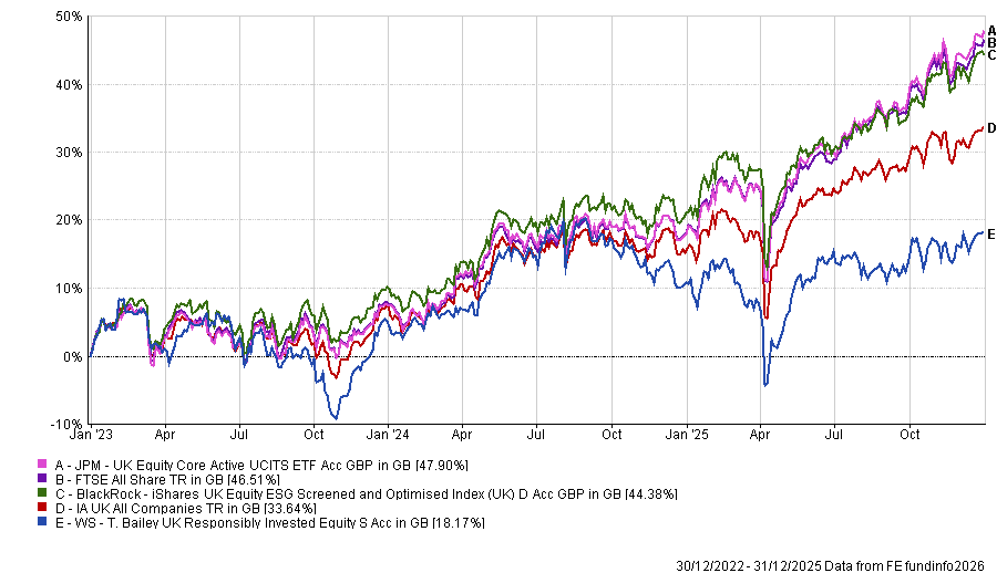 JPM UK Equity Core Active UCITS ETF was the only top-performer of the young UK funds. One of three funds on the list from the IA UK All Companies sector, it made a 47.9% return between 2023 and 2025, placing it in the top quartile of the peer group.
