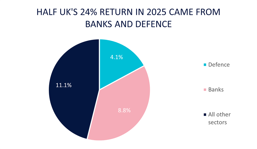 Investment flow data reveals that overseas investors have primarily driven the return to UK equities thus far. Domestic investors have yet to capitalise on these opportunities to the same extent. Passive flows from the United States gained momentum, with their impact most visible at the upper end of the index. Large-cap banks and defence stocks contributed over half of the FTSE All Share's impressive 24% annual return. In contrast, the FTSE World index of global developed companies delivered 15% by contrast.