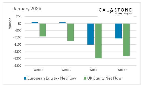 Investors pulled almost £700m from equity funds in January, with UK and European portfolios bearing the brunt, data from Calastone’s Fund Flows Index has shown.