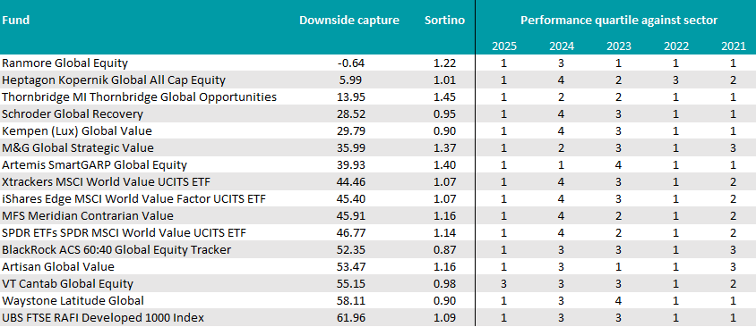 Another Alpha manager, Daniel O'Keefe, runs the Artisan Global Value fund, the biggest pure active value fund in the group at £4.4bn. Despite the scale, it maintained a strong defensive profile, as its downside protection and Sortino ratio testify, as per the table below.