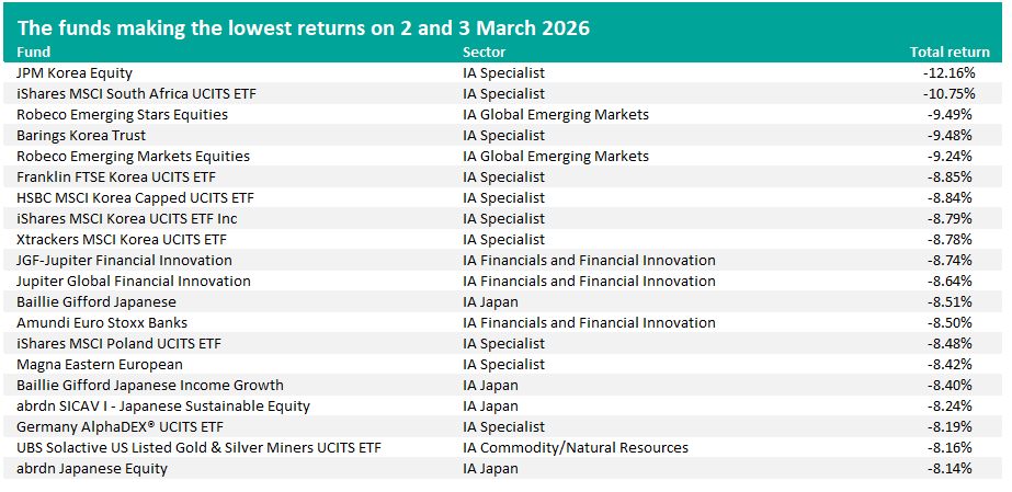 Close to 90% of funds in the Investment Association universe made a loss on Monday and Tuesday this week when investors went into risk-off mode following the start of a fresh conflict in Iran.