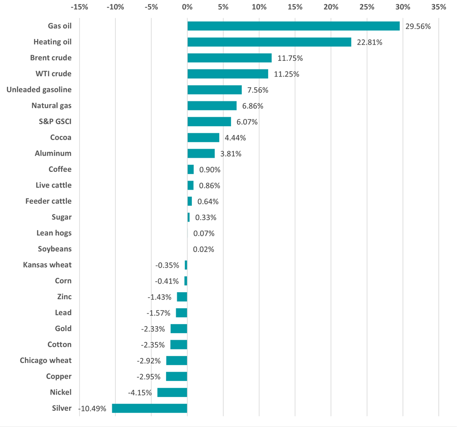 Global government bonds fell 1.5% and corporate bonds were down 1.1% but commodities (represented by the S&P GSCI) jumped 6.1% in local currency terms, driven largely by the spike in energy prices caused by Iran’s threats to close the Strait of Hormuz.