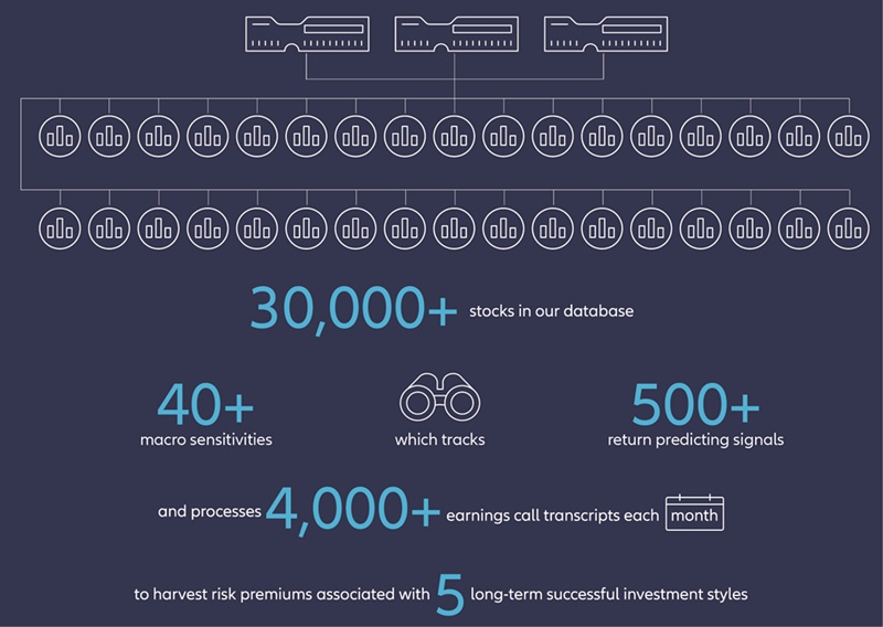 The process starts with breadth. The team's database spans more than 30,000 stocks listed in 47 countries, with prices updating around the clock. Every stock in that universe is scored across five styles: value, momentum, revisions, growth and quality. Those scores are generated using more than 500 return-predicting signals, drawing on over 8 trillion bytes of numerical data, 120 billion bytes of news and 21 billion bytes of earnings call transcripts.