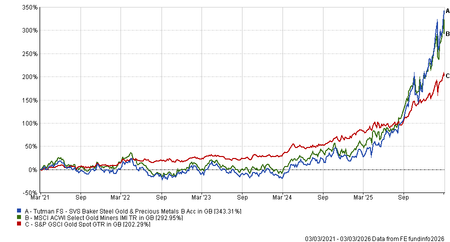 SVS Baker Steel Gold & Precious Metals invests in global precious metal miners and has achieved a 243.9% return in just 12 months. Over five years, the fund is up 343.3%, more than 100 percentage points above the gold spot price.