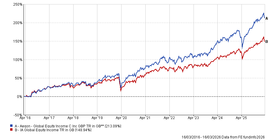 He aims for the bottom end of the top quartile or the top end of the second quartile each year. The fund has delivered a first or second quartile return in the IA Global Equity Income sector in seven of the past 10 years.