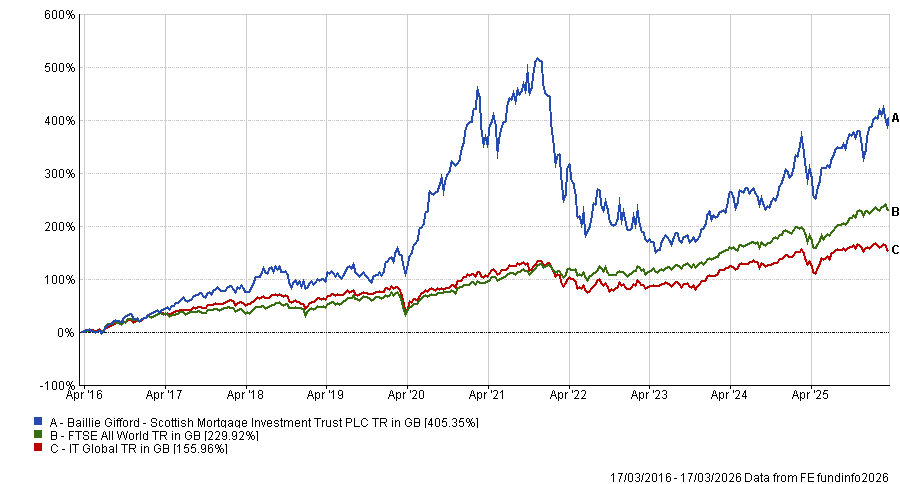 However, recent performance has been lumpy. The trust is the best performer in the IT Global sector over the past decade but suffered significant drawdowns in 2022, losing investors 45.7% in 12 months. It was the best fund in the peer group in 2025, making 24.7%, and has been in first or second place in four of the past 10 years.