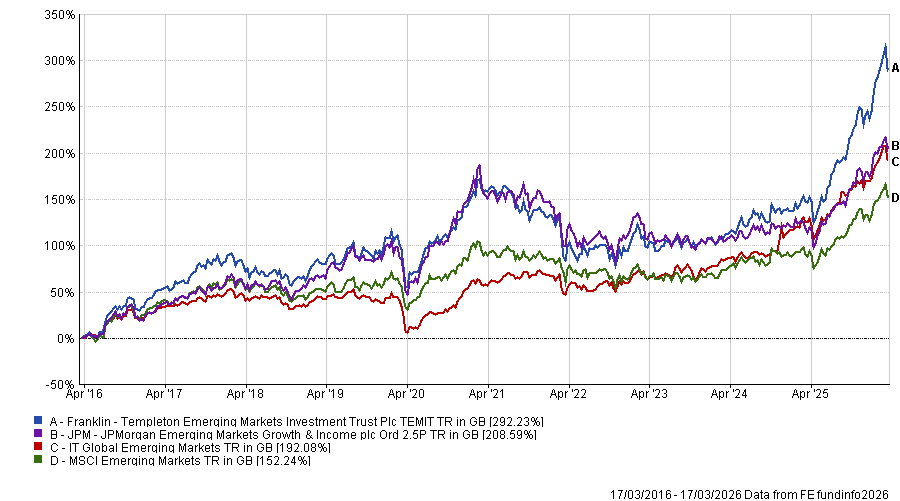 The two trusts are the best and second-best performers in the IT Global Emerging Markets sector over the past 10 years, with Templeton Emerging Markets up 292.2% while JPM Emerging Markets Growth & Income has made 208.6%.