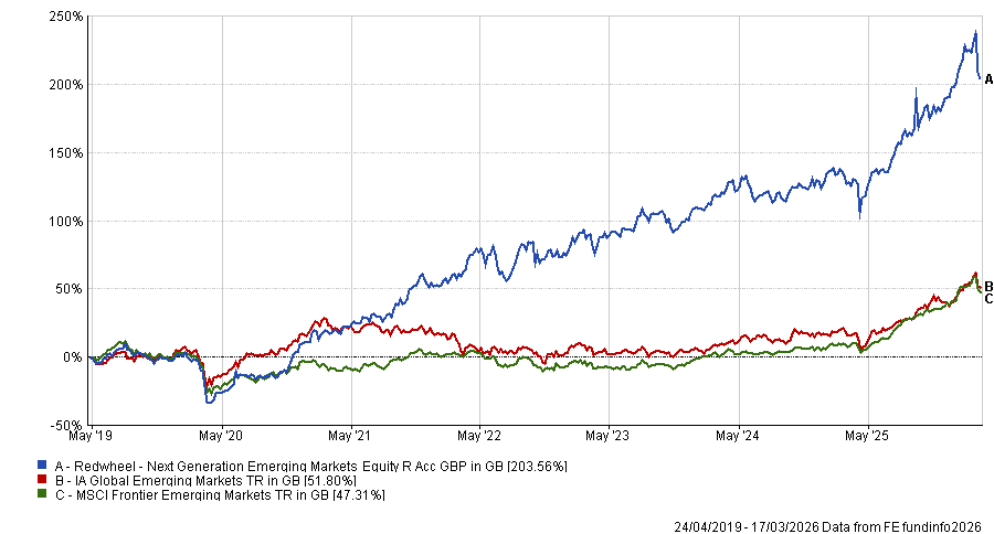 Redwheel Next Generation Emerging Markets Equity has been the best performer over the past five years in the 154-strong IA Global Emerging Markets sector, up 148.7%, as well as since its launch in 2019.