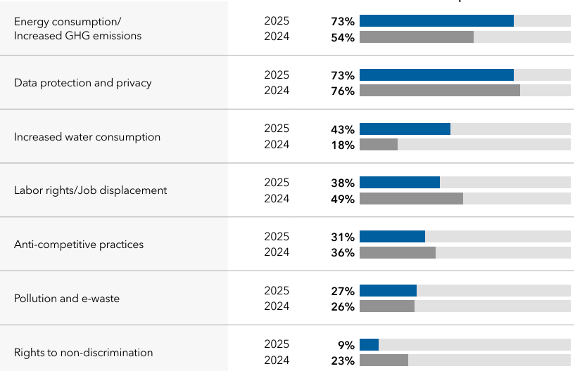 A 2025 survey published by Capital Group found that the majority of more than 1,000 investor respondents were concerned about the energy intensity and potential invasiveness of AI. The former logged the biggest increase in concern over one year.