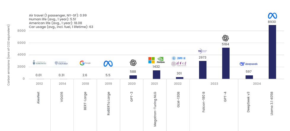 Estimated carbon emissions from training select AI models and real-life activities, 2012-2024