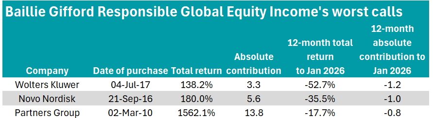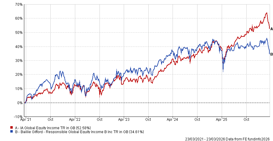 Against that backdrop, the £1.1bn Baillie Gifford Responsible Global Equity Income, co-managed by James Dow and Ross Mathison, has found itself slightly out of step, posting fourth-quartile returns in the IA Global Equity Income sector in both 2024 and 2025.