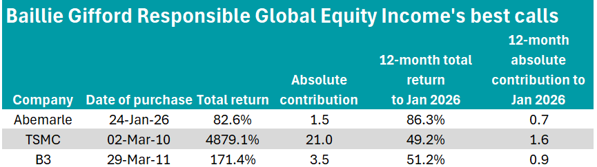 Some of the strongest names in the 12 months to the end of January 2026 were lithium producer Albermale, AI player TSMC and Brazilian financial exchange business B3.