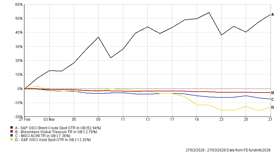 Assets across the board have fallen in the month since the conflict started – including perceived safe havens such as gold, which is down more than 15% in sterling terms.