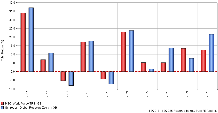 This is also backed up by the table below, which shows Schroder Global Recovery has beaten the MSCI World Value index in six of the past 10 calendar years. It is also on track to do so again in 2026.