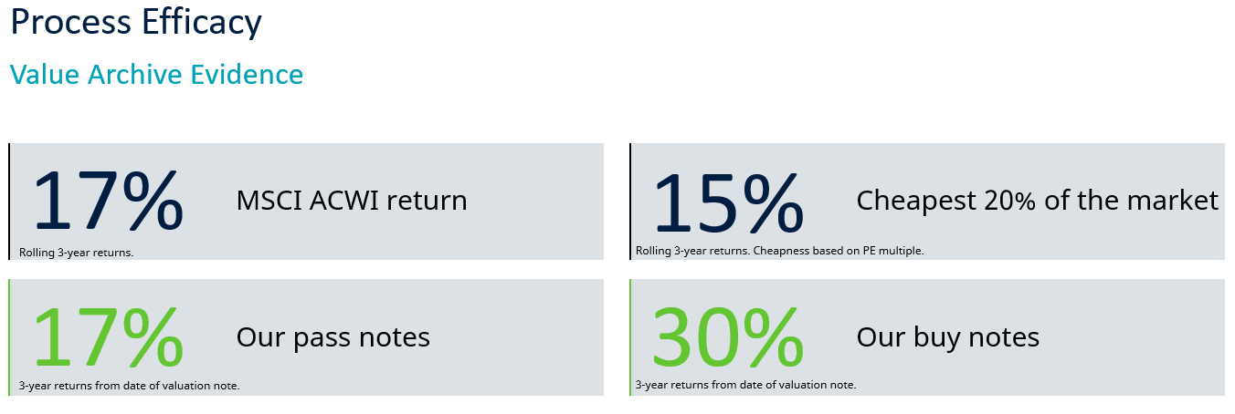 Over the past 10 years, the team has an enviable track record, according to its own data. The stocks that the team passed up on the opportunity to buy averaged a return of 17% three years later. By contrast, the stocks it bought averaged a three-year return of 30%, almost double.