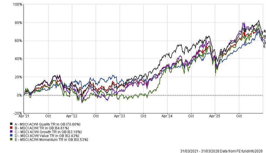 The figures back this assertion up. Looking at the performance of different investment styles across the MSCI AC World index over the past five years, there has only been a 10- percentage- point swing between the best and worst performers.