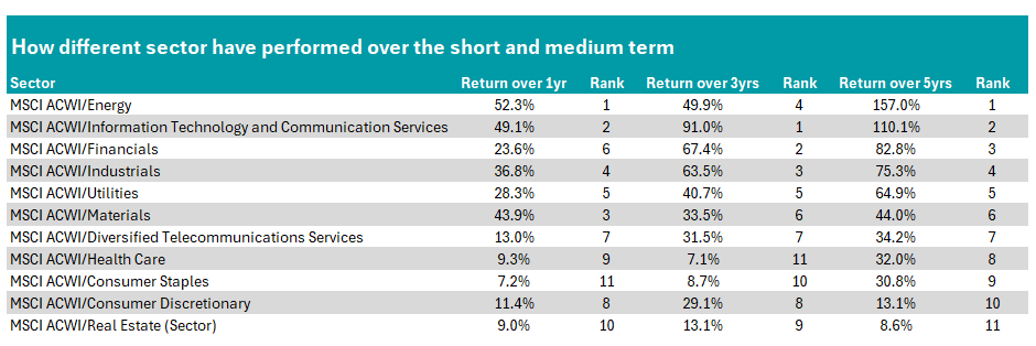 Banks and insurers – overlooked in the post-financial crisis era – roared back to life when central banks around the world ramped up interest rates to combat 2023's inflation that followed the pandemic. Over the past three years, it has been the second-best-performing MSCI AC World sector, as the table below shows.