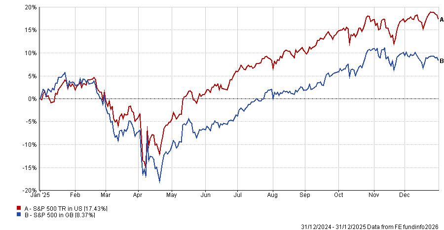 As shown in the graph below, although the S&P 500 (in dollar terms) would have made around 17% in 2025, UK investors made less than half at 8.4%.