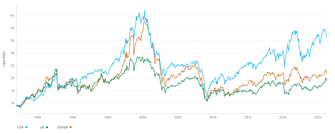 The same data shows the US CAPE briefly touched 47x at the peak of the dot-com bubble in early 2000, before collapsing to below 25x within three years. The UK, by contrast, sits at around 19x – less than half the US reading.