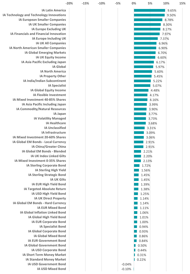 The three European equity sectors can be found towards the top of the best-performing peer groups, with Premier Miton European Opportunities (up 17.1%), State Street SPDR MSCI Europe Industrials UCITS ETF (12.2%), State Street SPDR MSCI Europe Financials UCITS ETF (11.9%), CT European Select (11.7%) and CT Select European Equity (11.7%) boasting the highest returns.