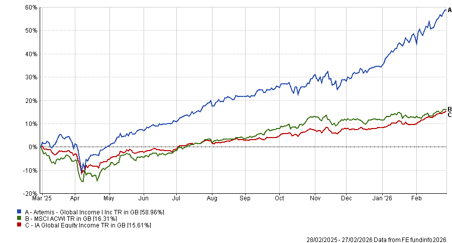 The Artemis Global Income fund returned 59% over the 12-month period, against 16.3% from the MSCI AC World index and making it the best performer in the IA Global Equity Income sector. Overlapping with this period, 2025 was the fund's best calendar year since its 2010 launch, on both an absolute and relative basis.