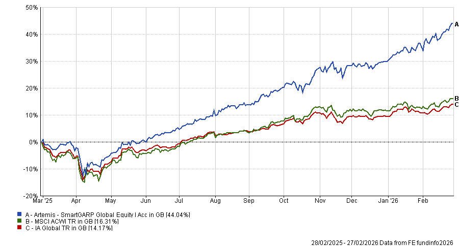 The Artemis SmartGARP Global Equity fund returned 44% in the 12 months to 28 February 2026, against 16.3% from the MSCI AC World, with stock selection accounting for nearly all of the outperformance. This put the fund in the top quartile of the IA Global sector.