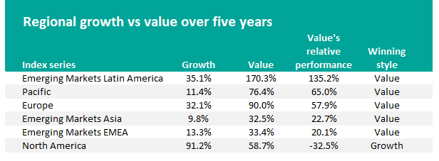 But drilling down even further shows that value investing has actually led in most areas apart from one very notable exception. Value has made higher returns in Latin America, the Pacific region, Asia, Europe and EMEA.