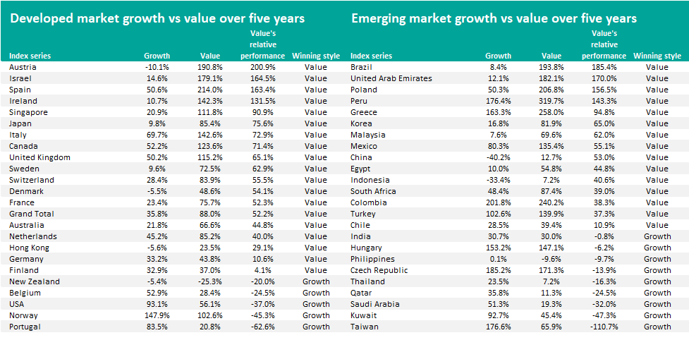 Value has outperformed growth over the past five years in 19 of the 24 countries classed as developed markets by MSCI. Israel, Spain and Ireland join Austria in having more than 100 percentage points between their value and growth indices.