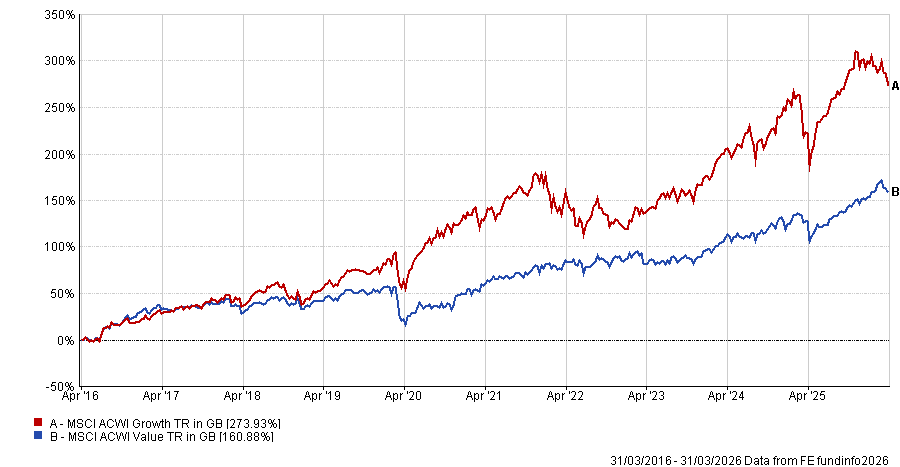 Growth’s outperformance is reflected in the 10-year numbers. FE fundinfo data shows the MSCI AC Growth index has made a 273.9% total return in sterling over the decade to the end of March 2026, compared with just 160.9% from its value counterpart.