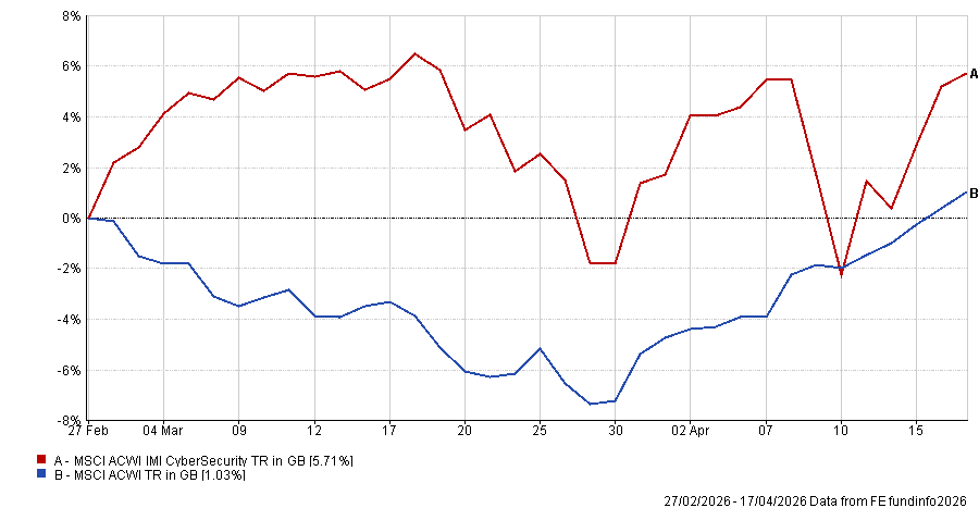 For example, since the start of the Iran war, the MSCI Cybersecurity index has made 5.7% versus 1% from the MSCI AC World – as many expect Iran-affiliated proxies to step up cyber-warfare against the country's enemies.