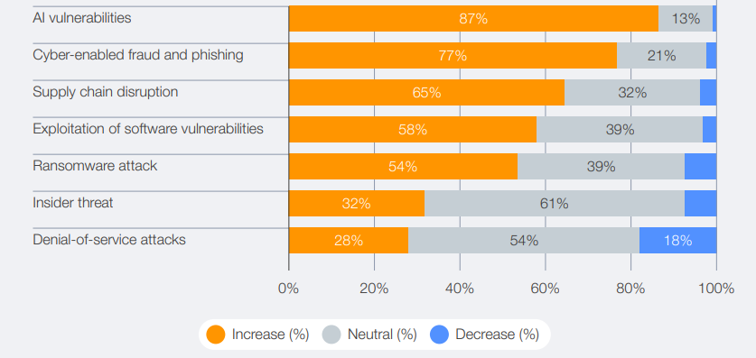 The build-out of AI has amplified risks across the landscape. Indeed, 87% of respondents to the WEF survey identified AI-related vulnerabilities as the fastest-growing cyber risk in 2025.