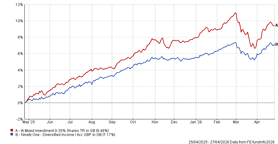 Ninety One Diversified Income returned 6% over the year to 31 March, just behind the 6.4% from the IA Mixed Investment 0-35% Shares sector. Over five years, it returned 12.6%, outpacing the sector’s 9.4%.