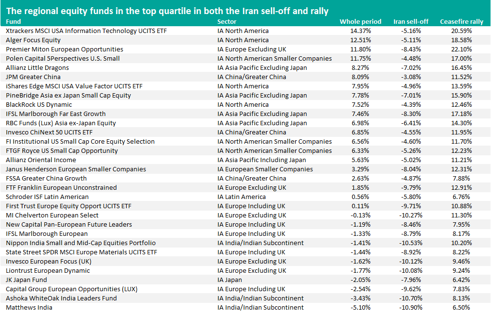 Another 31 funds from the various regional equity fund sectors in the Investment Association universe have top-quartile returns for the Iran war sell-off and rebound.