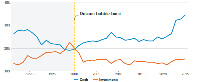 Over the same period, cash holdings have risen to 35% of financial assets, the highest proportion since records began in the 1980s.